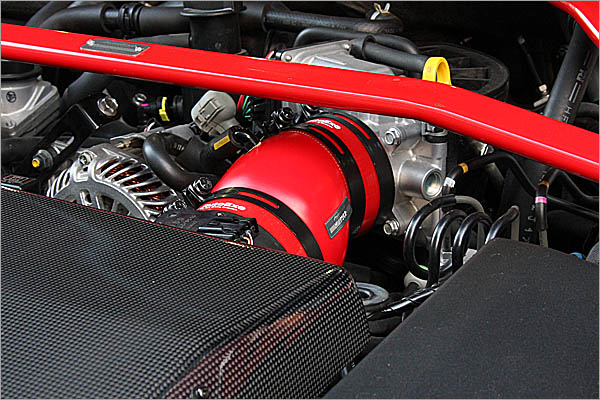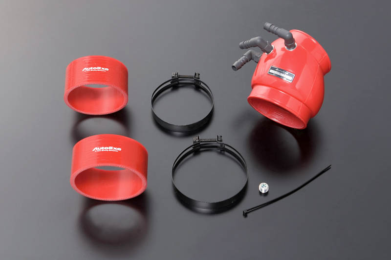 The AutoExe intake suction kit for 2004-2012 RX-8 consists of a FRP main pipe and multi-layer polyester/silicone connectors, all in the trademark red of the company. By smoothing out airflow, and deforming much less than the stock intake elbow, better engine response is achieved.